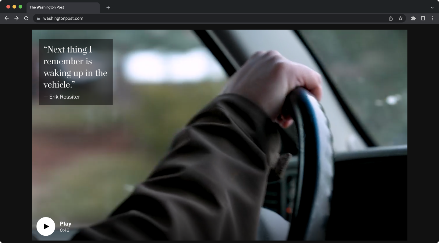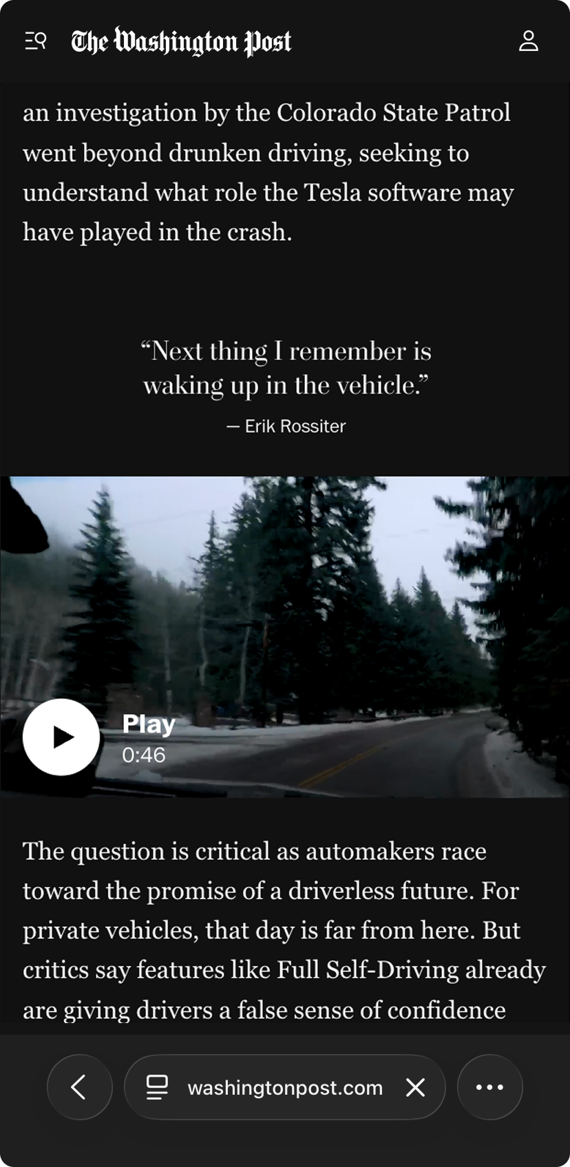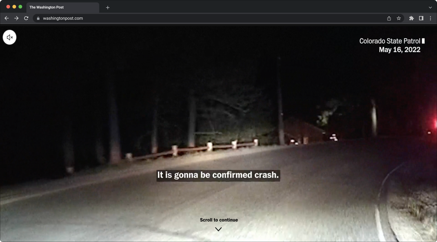 The first project I worked on was an investigation into the death of Hans von Ohain in 2022, a Tesla recruiter who was killed in a crash while the car’s driver-assistance system was engaged. The reporting included dashcam footage from first responders, video of Von Ohain’s friend, Erik Rossiter, who was involved in the crash at the scene, and video of Von Ohain’s widow, Nora. The footage was both moving and informative, and helped the reader fully understand what happened during the crash, as well as its aftermath. It was important to me that we displayed the videos in a way that was thoughtful and engaging, and also respectful of Von Ohain’s friends and family who had agreed to be filmed.