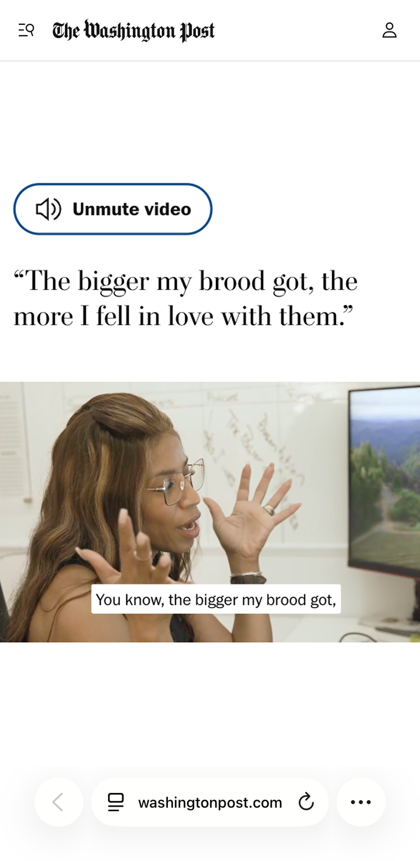The second project I was assigned told the story of April Simpkins, whose daughter, former Miss USA Cheslie Kryst, died by suicide in 2022. Our videographer worked closely with the reporter to tell Simpkins’ story from her own perspective, so we felt it was important to create a similar video experience that allowed readers to watch the footage while still respecting user preferences.