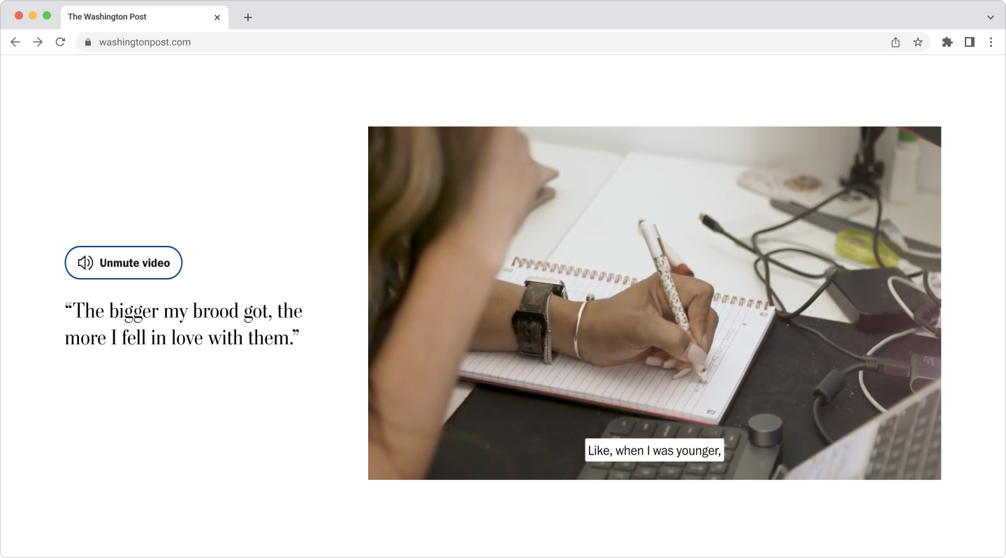 Since the videos were documentary-style b-roll, we felt comfortable using autoplay with the sound automatically turned off, but we still wanted to encourage users to enable audio and engage even closer with the footage. I similarly experimented with pairing quotes and videos, but this time wanted to include more white space to suit the quiet, thoughtful nature of the story.